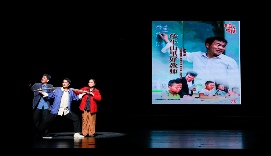 近年来,导演系师生坚持以习近平总书记重要回信精神为根本遵循,深入学习贯彻党的二十大精神,积极推进课程思政建设,结合专业特色创排了戏曲小戏小品《可爱的中国》专场演出,豫剧小戏《扁担校长》是《可爱的中国》中的一个剧目。该剧以“感动中国2018年度人物”、第七届全国道德模范“全国敬业奉献模范”、2021年“全国优秀共产党员”张玉滚为原型,讲述了他为改变山里孩子命运,从乡村教师干起,靠着一根从老校长手中接过的扁担,从大山外为孩子们挑来学习生活用品,千方百计上好每一堂课的动人故事。
