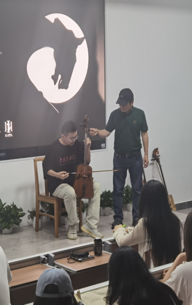 张老师老师现场用马头琴演奏了传统曲目以及用马头琴模仿大提琴、二胡等多种乐器曲目,并与学生共同演奏一曲《万马奔腾》,充分展示了马头琴声音及演奏的包容性,现场气氛热烈。讲座最后,张老师与在场学生进行了演奏互动,并对学生提出的问题给予专业解答。