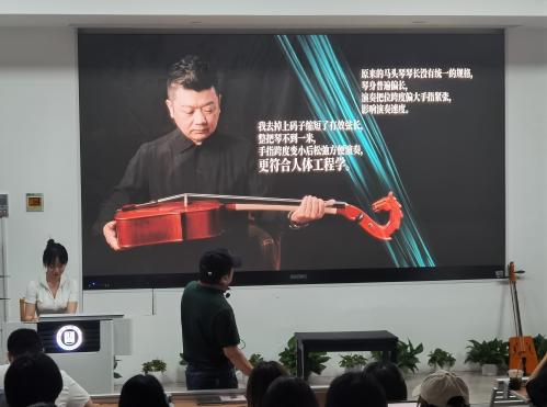 主讲人通过列举其他弓弦乐器演奏法、形制、演奏技术、音色等方面,阐述了马头琴的改革与创新历程。他讲到最早马头琴的形制及演奏使演奏者并不能达到完全放松的状态,通过对马头琴形制的改革,以及演奏手法的改变后可以使演奏者更容易学习,也可以使本身具有一定弓弦乐演奏基础的同学更易上手。这一重大的改革使得在马头琴演奏及推广应用上起到了非常大的助力。