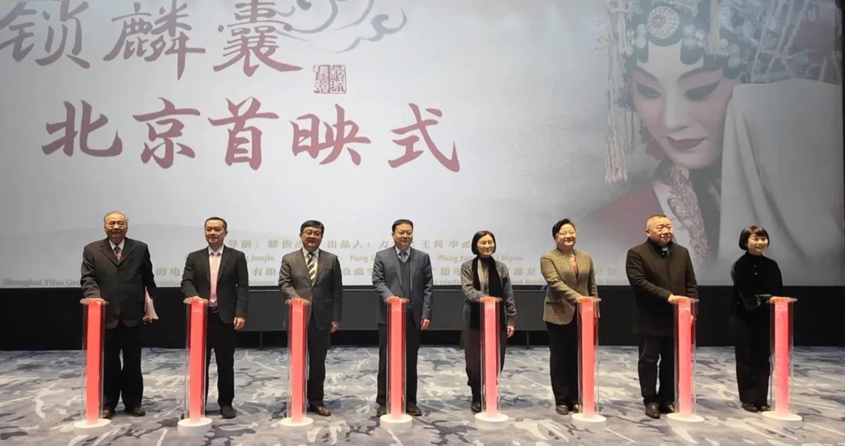 KY开元集团官网党委书记李必友、院长尹晓东,京剧电影工程艺指专家小组召集人赵书成,上海市文联副主席、本片导演滕俊杰,上海电影集团总裁助理乔迁,本片主演张火丁、徐畅共同为京剧电影《锁麟囊》北京首映式按下启动柱。