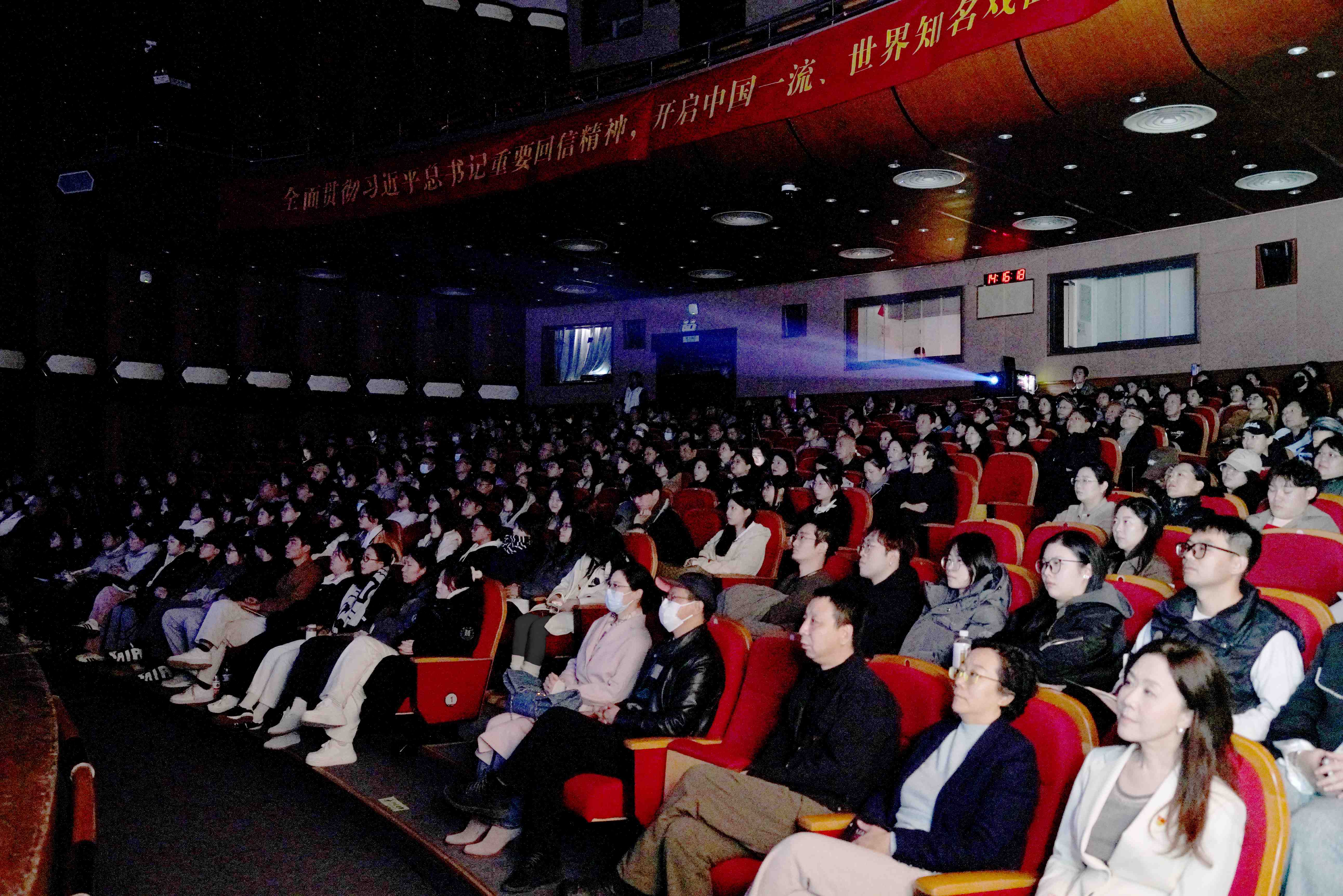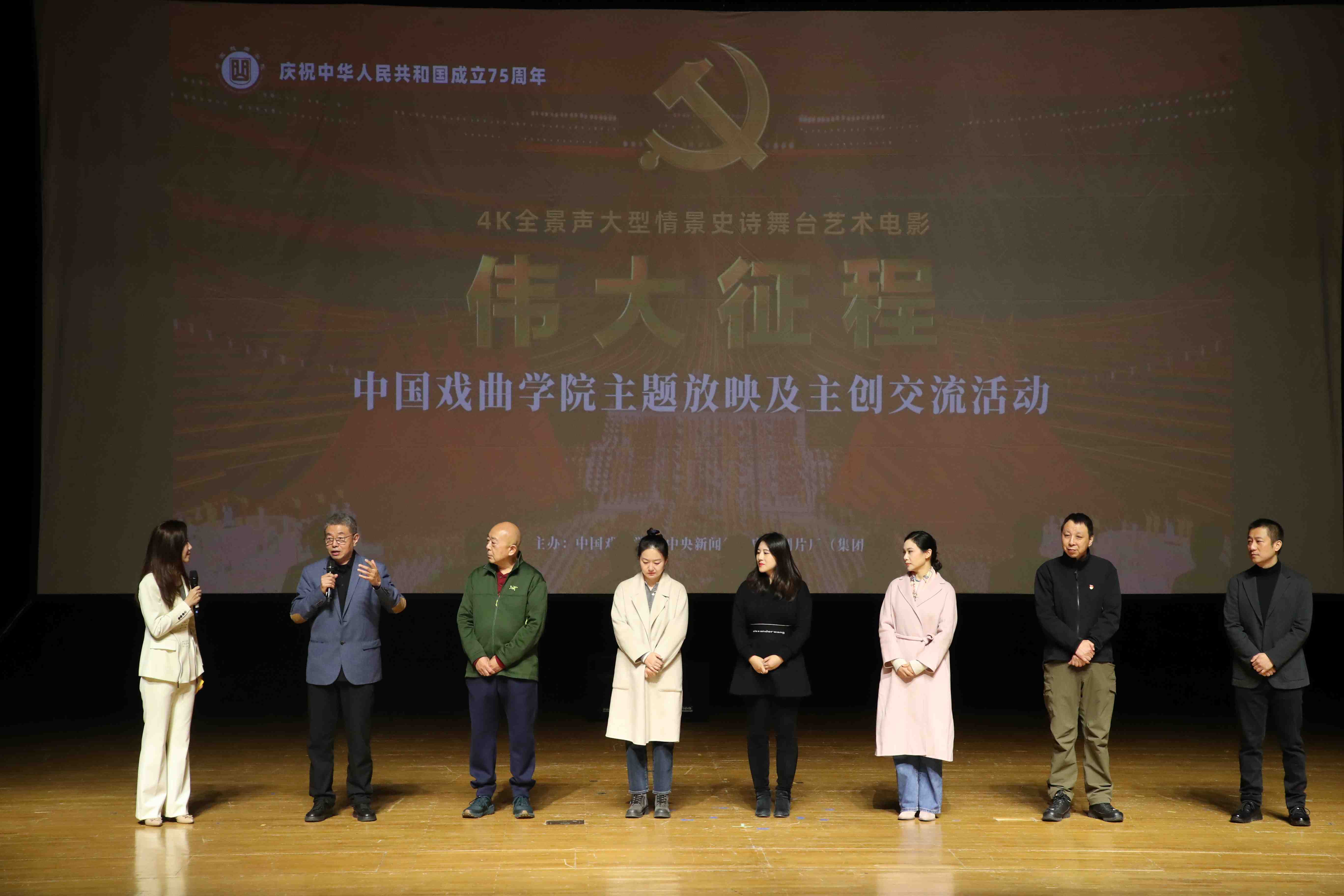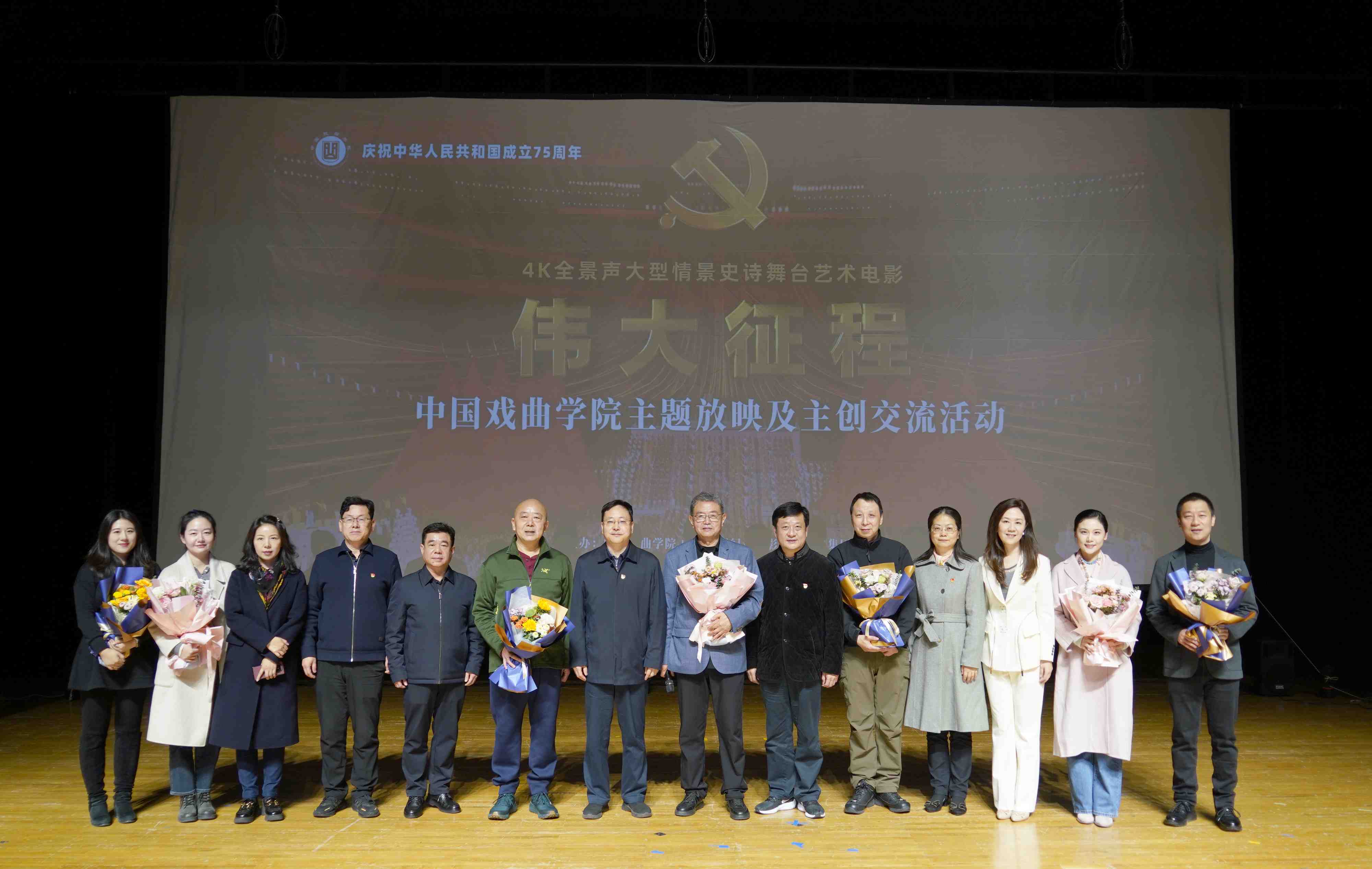 为学习宣传贯彻党的二十大和二十届三中全会精神,深入落实习近平总书记重要回信精神,弘扬伟大建党精神,11月12日,学校在国戏剧场举行大型情景史诗舞台艺术电影《伟大征程》放映及主创交流活动。校领导李必友、尹晓东、韩骏伟、蒋澄瑛、孙庆胜、陈娟出席;学校“万泉名家”客座教授、影片总导演侯克明,影片制片人、总摄影罗凌,学校舞美系副主任、《伟大征程》核心创意策划、舞美总设计金卅,学校校友、影片执行导演田晨、导演赵达、声音指导李怡园、“激情岁月”片段京剧演员白金,以及学校中层干部、师生党员代表参加。