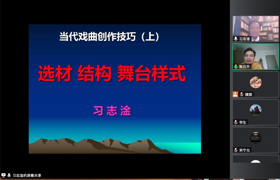 3月16日、17日,著名剧作家、国家一级编剧习志淦为戏文系师生进行了三次线上讲座。习志淦的戏曲创作成果丰硕,他先从自己的创作历程讲起,感慨与国戏结缘已40多年。在第一讲中,习志淦从选材、结构、舞台样式等角度出发,以他的代表作《徐九经升官记》和《洪荒大裂变》为例阐述了当代戏曲创作的技巧。《徐九经升官记》有着精妙的结构,在开场便将一个大难题摆在主人公的面前,而《洪荒大裂变》则代表了他在戏曲创作上的一种新的综合与突破。在第二讲中,习志淦又以其代表作《膏药章》《美女涅槃记》为例,讲述了在创作戏曲作品时,编剧应具有格局意识、创建好的戏剧情境,才能创作出生动鲜活、让观众喜爱的人物形象。在第三讲中,又以他其创作的话剧《牵挂》和京剧《襄阳米颠》为例,分析了他在当代戏曲创作中,提炼素材、构思细节、设计语言的成功经验。在整个讲座过程中,习志淦采取“边看边讲”的方式,同学们一边观看其戏曲作品视频片段,一边聆听他细致入微的讲述。