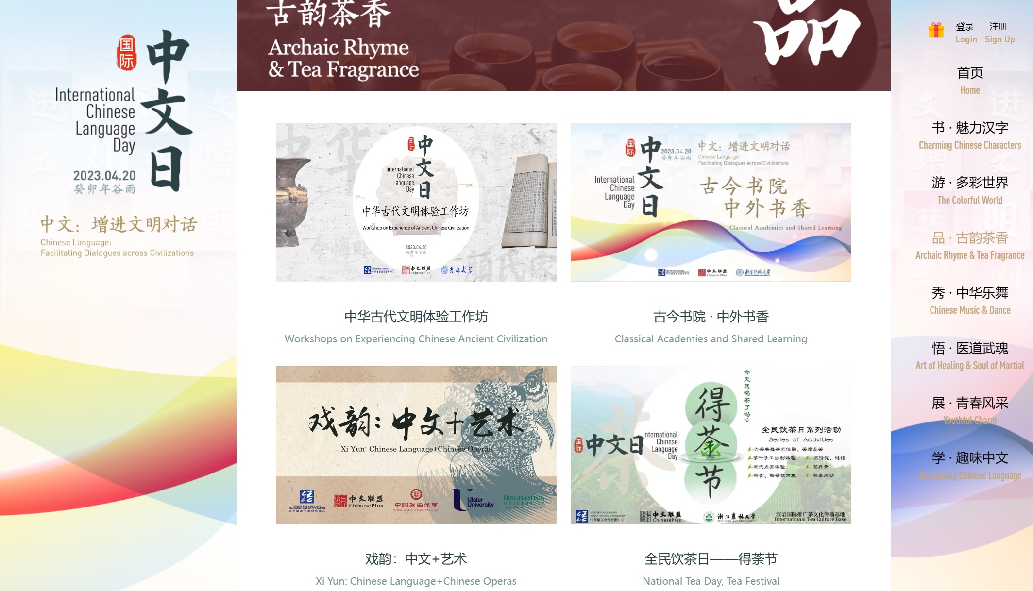 2023年4月20日是中国农历谷雨节气,也是全球第14个“联合国中文日”。自2020年起,为了推动中文的国际应用,促进中外人文交流,教育部中外语言交流合作中心携手国际中文教育网络平台“中文联盟”,以“联合国中文日”为契机,发起了“国际中文日”活动,推动“国际中文日”成为全球中国语言与文化学习者、爱好者共同的节日。目前,“国际中文日”已连续举办三年,吸引了全球近200个国家和地区的1.5亿民众参与。本届“国际中文日”是第四届,以“中文:增进文明对话”为主题,邀请世界各国朋友分享中国语言与文化教育在推动世界多元文明对话与交流中的成果和故事。