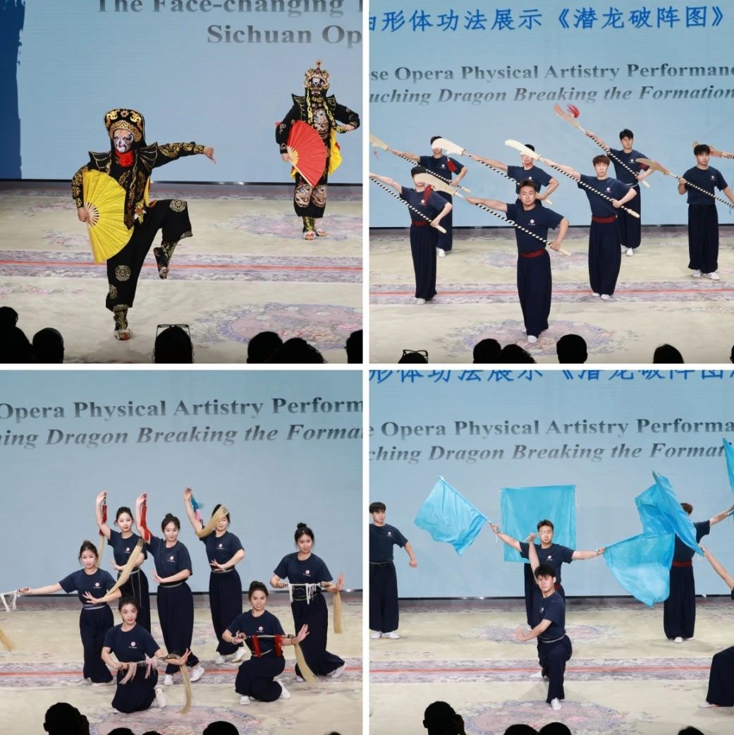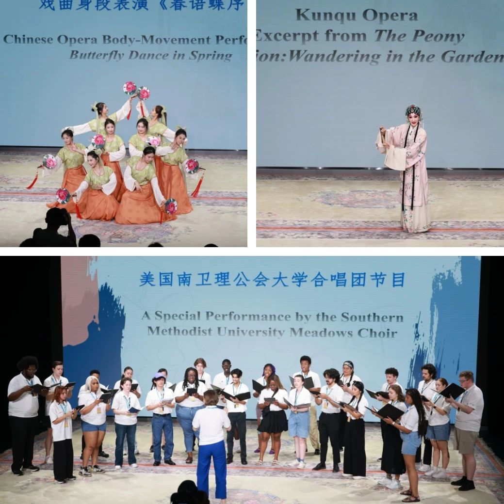 在交流演出环节,KY开元学生表演的戏曲身段《春语蝶序》尽显古典意境,昆曲《牡丹亭·游园》柔曼婉转、余音绕梁,京剧《扈家庄》与河北梆子《借扇》通过扈三娘和孙悟空的经典形象展现戏曲多元魅力,川剧《变脸》中瞬息万变的脸谱引得美方青年惊叹连连,戏曲形体功法展示《潜龙破阵图》刚柔并济、整齐划一,彰显戏曲艺术生生不息的活力。美方南卫理公会大学合唱团和风声合唱团现场献唱《Flower to Kindness》《We Are the World》,和谐纯净的声线、真挚饱满的情感,为这场交流写下和而不同、美美与共的注脚。来自不同民族文化土壤的音色与旋律在相互映衬中,凸显各自独特的魅力,共同成就一幅相知相亲、和合共生的文明互鉴画卷。在互动与体验环节,KY开元表演系研究生带领美方青年分别体验了水袖、折扇、马鞭等戏曲身段,多名美国青少年踊跃登台学习,现场欢呼声与掌声此起彼伏。
