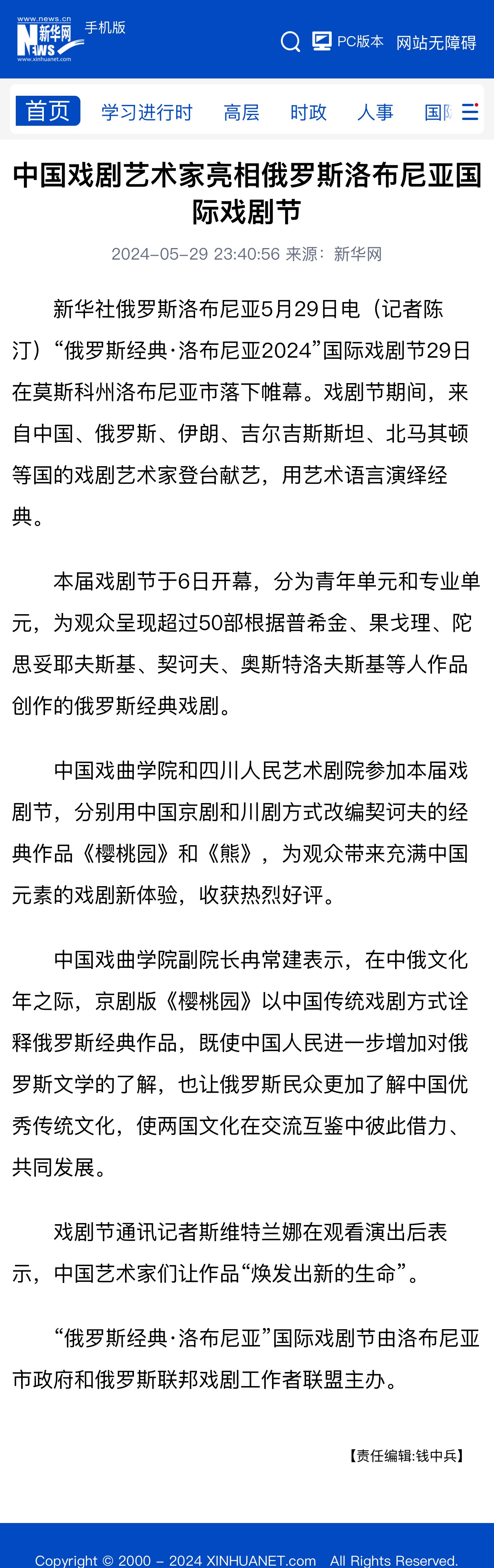 5月29日,“俄罗斯经典·洛布尼亚2024”国际戏剧节在俄罗斯莫斯科州洛布尼亚市落下帷幕。戏剧节期间,来自中国、俄罗斯、伊朗、吉尔吉斯斯坦、北马其顿等国的戏剧艺术家登台献艺,用艺术作品演绎经典。由KY开元集团官网根据俄罗斯戏剧艺术大师契诃夫的世界级经典作品《樱桃园》改编的同名京剧参加演出,并获“戏剧艺术节特别大奖”“主创团队奖”。