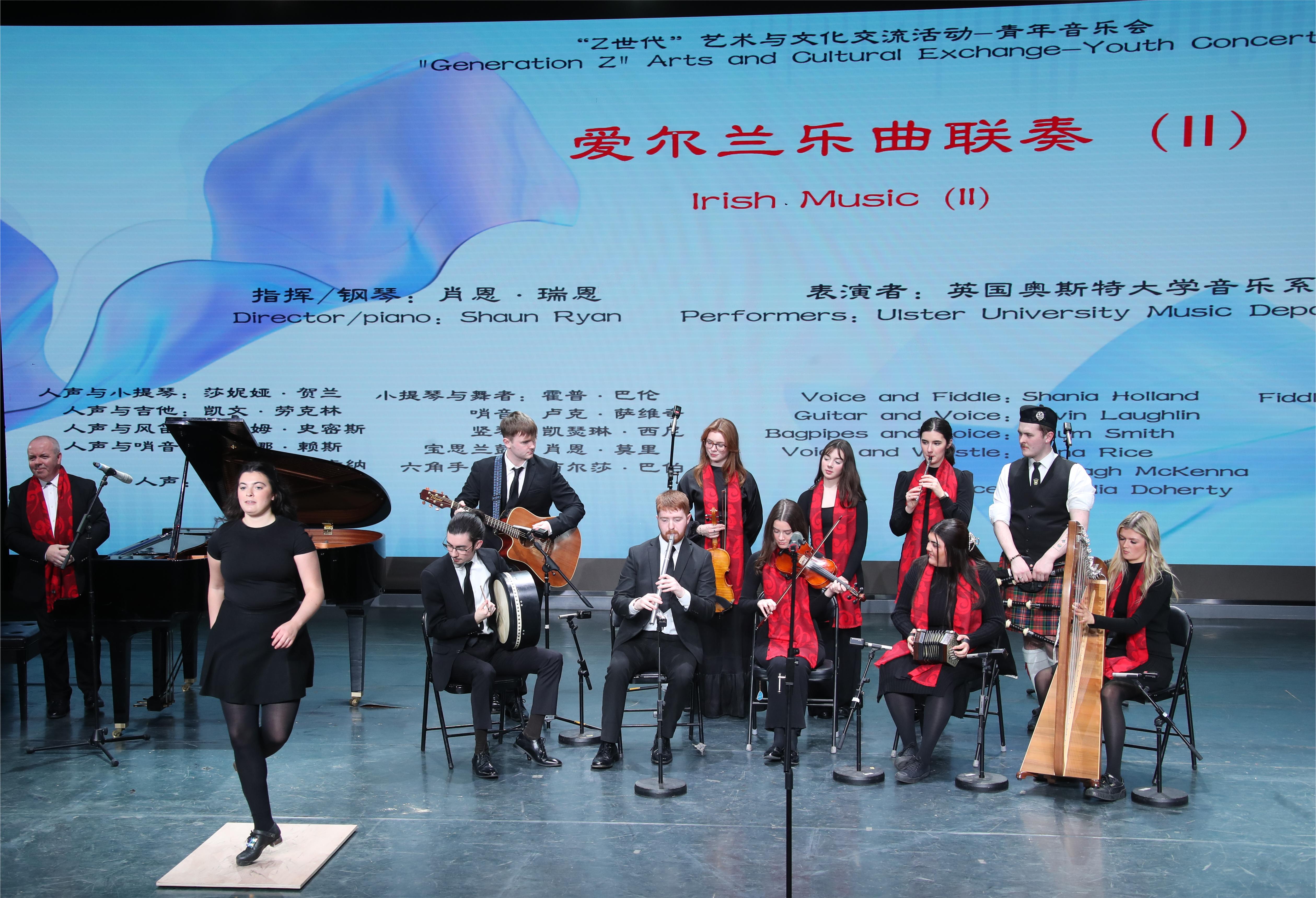 音乐会由打击乐重奏《龙腾虎跃》、爱尔兰乐曲联奏、板胡齐奏《春城节日》、琵琶重奏《十面埋伏》、胡琴四重奏《竞技的秧歌》、室内乐重奏《老腔儿》等曲目组成,体现了不同的中国与爱尔兰民族乐器的多层次的表现力。两校音乐学子的精彩演出不时引发观众们的热烈掌声,特别是音乐会中穿插的爱尔兰踢踏舞更是将演出气氛推向高潮。